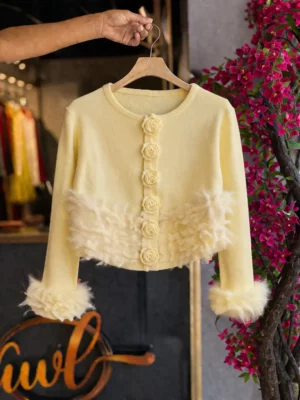 Girls Premium Fur Crop Top – Rose Button Designer Winter Top