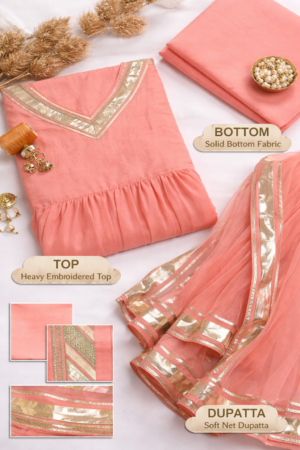 Women’s Peach-Pink Kurta Palazzo Set – Sheer Dupatta with Gold Accents