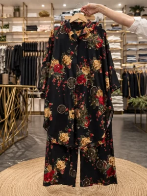 Women’s Floral Printed Co-Ord Set – Oversized Shirt with Straight Pants