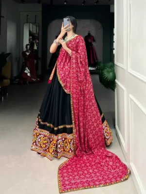 Command attention in every festive arena with the Black Heritage Capital Chaniya Choli, a high-value cultural asset adorned with traditional Kutchi embroidery and modern festive flair. Designed for women who see fashion as both a personal statement and a long-term investment, this ensemble delivers unmatched style returns during Navratri nights, heritage weddings, and high-profile cultural galas.