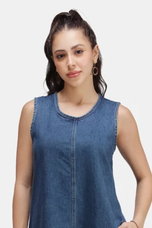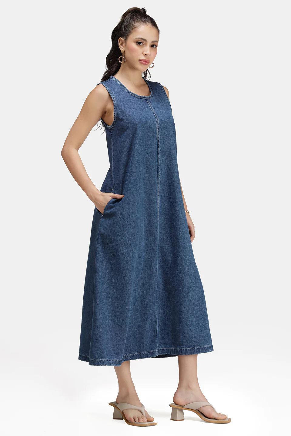 Meet the denim dress that always delivers returns. The Blue-Chip Ease Pocketed Denim Midi Dress is your effortless answer to busy days and spontaneous plans—polished enough for brunch and galleries, relaxed enough for markets and travel. Cut from soft, breathable denim in a rich indigo wash, this sleeveless A-line silhouette skims the body and floats away from the hips for movement that feels as good as it looks. A clean scoop neckline and elongating center seam create a long, lean line, while discreet side pockets add the practicality you reach for again and again.
