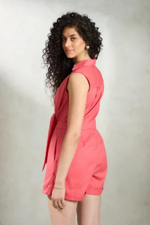 The sleeveless design features a sharp collared neckline and a flattering wrap-front bodice, cinched at the waist with a self-tie sash that creates a custom, figure-enhancing fit. The romper’s tailored shorts keep the look sleek and contemporary, making it an effortless choice for everything from a finance networking brunch to a stylish rooftop cocktail party.