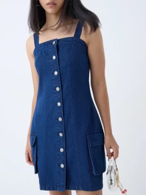 The dress features broad shoulder straps that frame the neckline gracefully, leading into a flattering square neck that showcases the collarbone. Down the center, a functional button placket runs from neckline to hem, offering adjustable styling options—keep it fully closed for a neat, fitted appearance, or unfasten a few buttons at the hem for a flirtatious touch of movement.