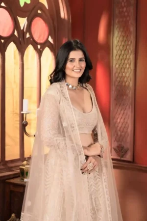 Crafted in a soft beige hue, the lehenga features intricate all-over thread embroidery in paisley and floral motifs, paired with fine net fabric that flows with regal grace. The elaborate patterns on the hemline, inspired by Mughal-era artistry, are highlighted with delicate sequin detailing that shimmers beautifully under chandeliers or wedding lights.