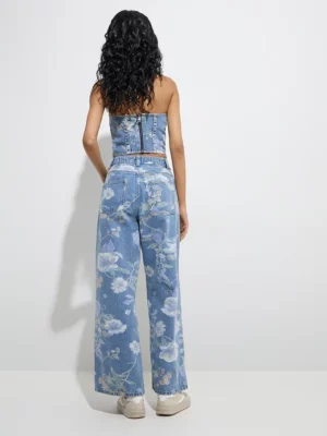 Denim Floral Co-ord Set – Strapless Corset Top & Wide-Leg Jeans