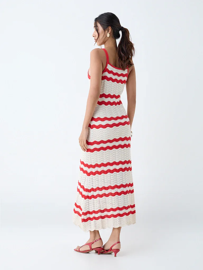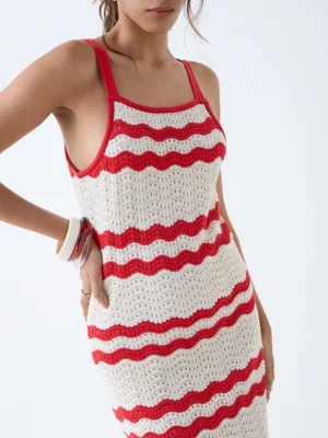 The soft ecru base is beautifully complemented by bold red wave stripes, adding a playful yet sophisticated touch that mirrors the latest global fashion trade trends. The lightweight crochet-knit texture allows for breathability while draping gracefully over the body, making it perfect for warm summer days and breezy evenings.