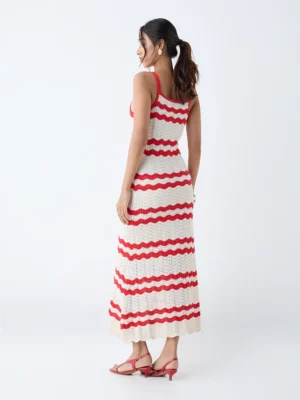 Embrace the effortless elegance of Ecru & Red Wave Knit Maxi Dress, a statement piece that brings together US-trend vacation styling with timeless European resort charm. Designed for women who appreciate investment-worthy wardrobe choices, this dress blends comfort, style, and versatility—making it the ideal companion for everything from seaside brunches to rooftop cocktail hours.