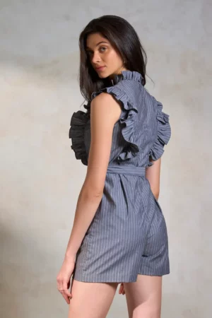 Executive Pinstripe Ruffle Romper – Wall Street Chic Edition