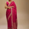 Crafted from a premium silk-georgette blend, the saree offers a fluid drape that moves like a well-balanced portfolio—graceful, confident, and always in control. The gold embroidery, reminiscent of vintage bullion patterns, adds a layer of opulence that speaks to both heritage and high-end trade aesthetics. It’s a look that resonates with global fashion trends while staying rooted in traditional Indian artistry.