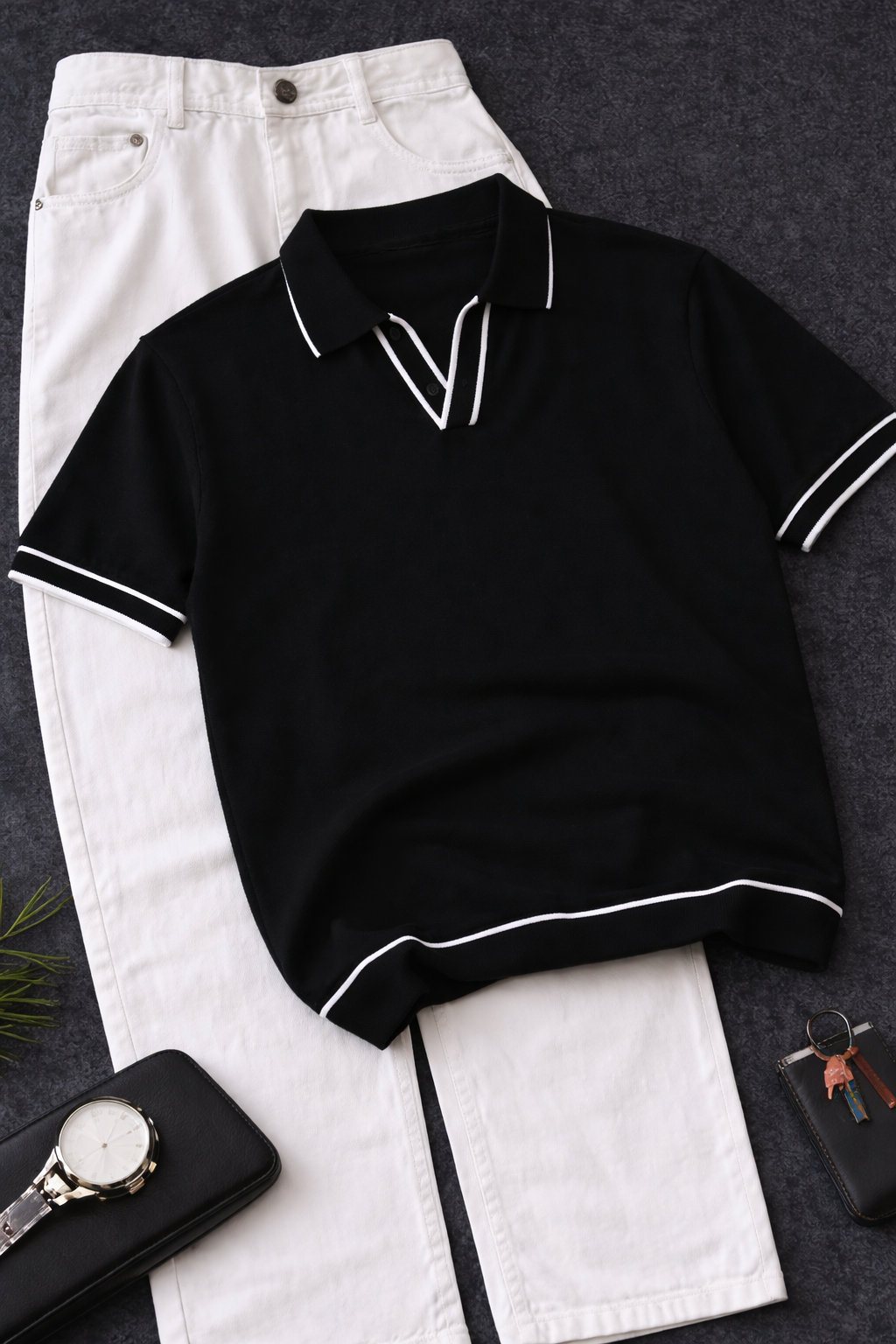 The solid black polo with subtle contrast detailing on the collar and sleeves adds a touch of sophistication, while the white trousers balance the outfit with a fresh and polished vibe. Designed for comfort and versatility, this combo is ideal for both casual and semi-formal settings.