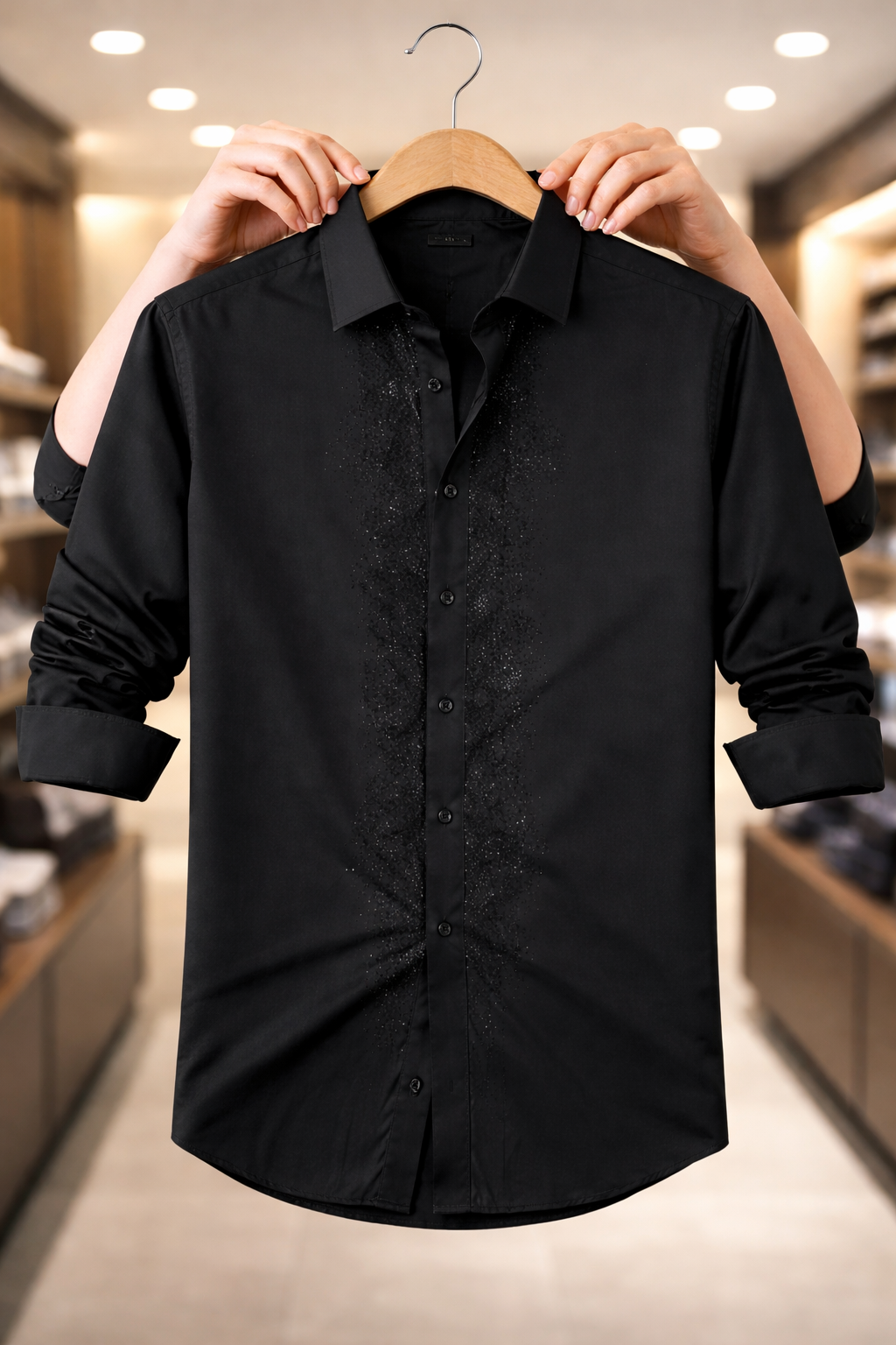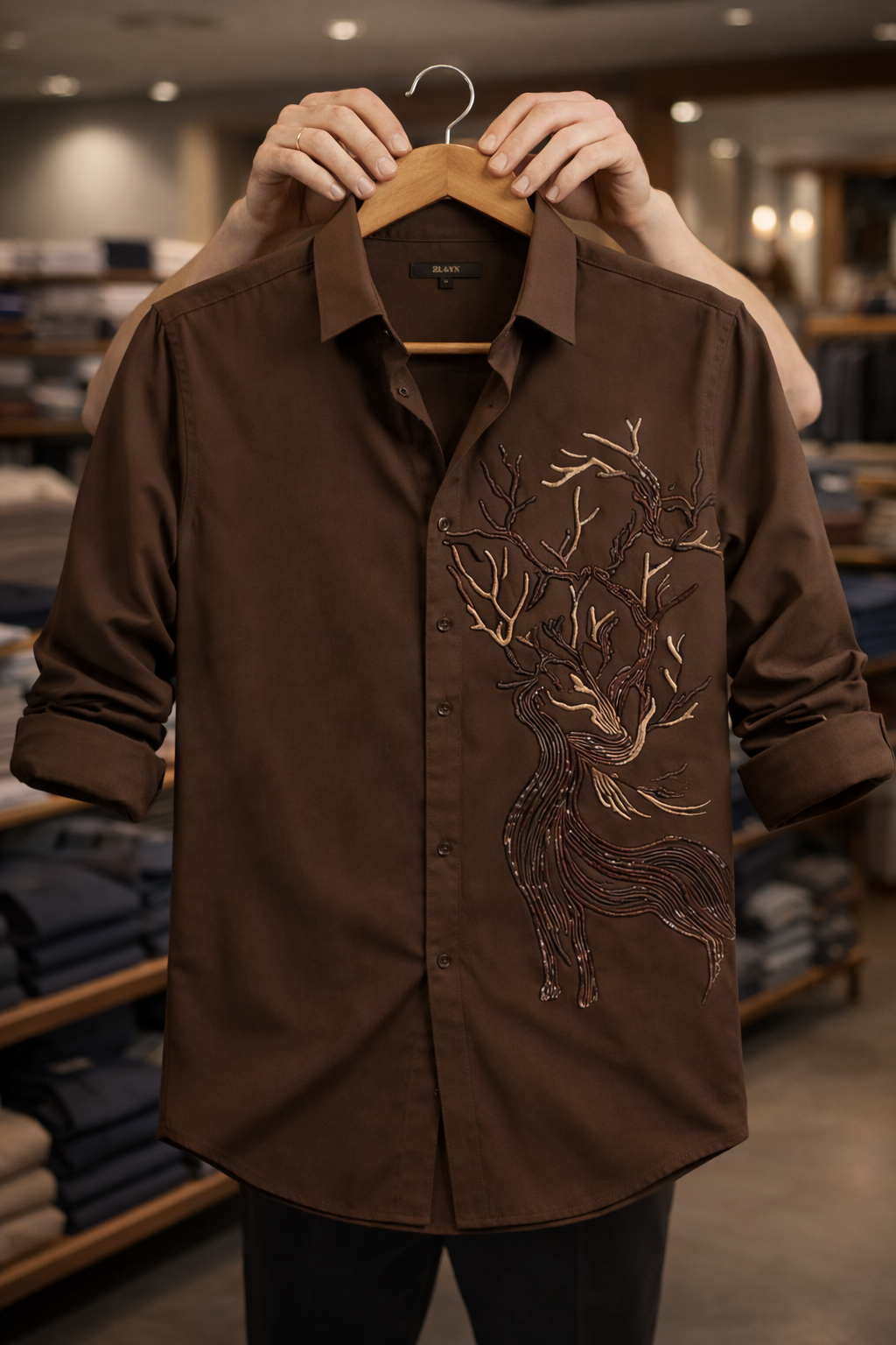 Elevate your style with this unique men’s designer shirt, crafted for a bold and artistic look. This standout piece features a premium solid shirt enhanced with an eye-catching embroidered deer design, adding a touch of creativity and elegance to your wardrobe.