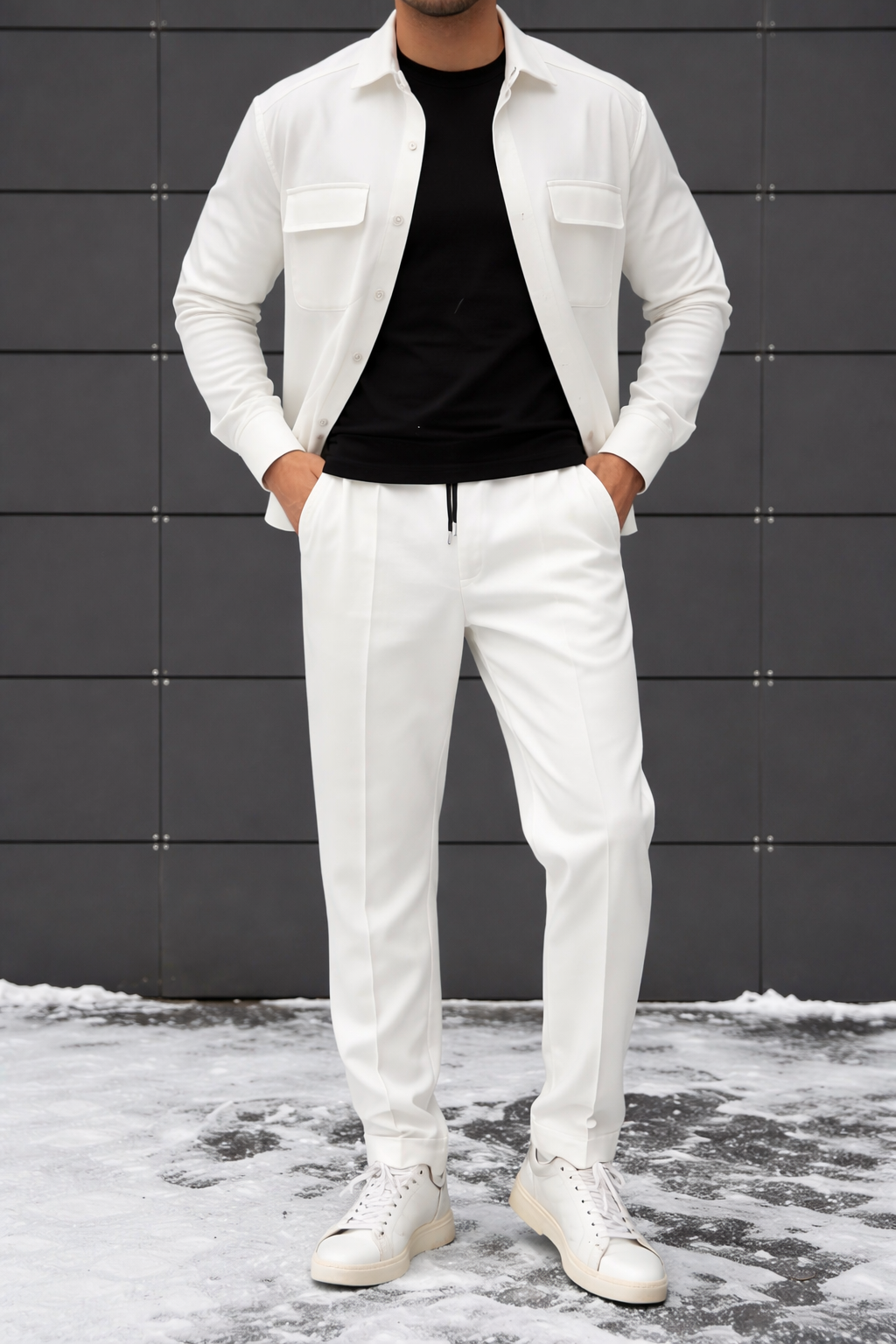 The black button-down overshirt adds a bold and structured touch with its functional chest pockets and sleeve zipper detail, while the crisp white inner t-shirt balances the outfit with a fresh contrast. The slim tapered pants with a comfortable drawstring waist give a modern fit that is both stylish and easy to wear.