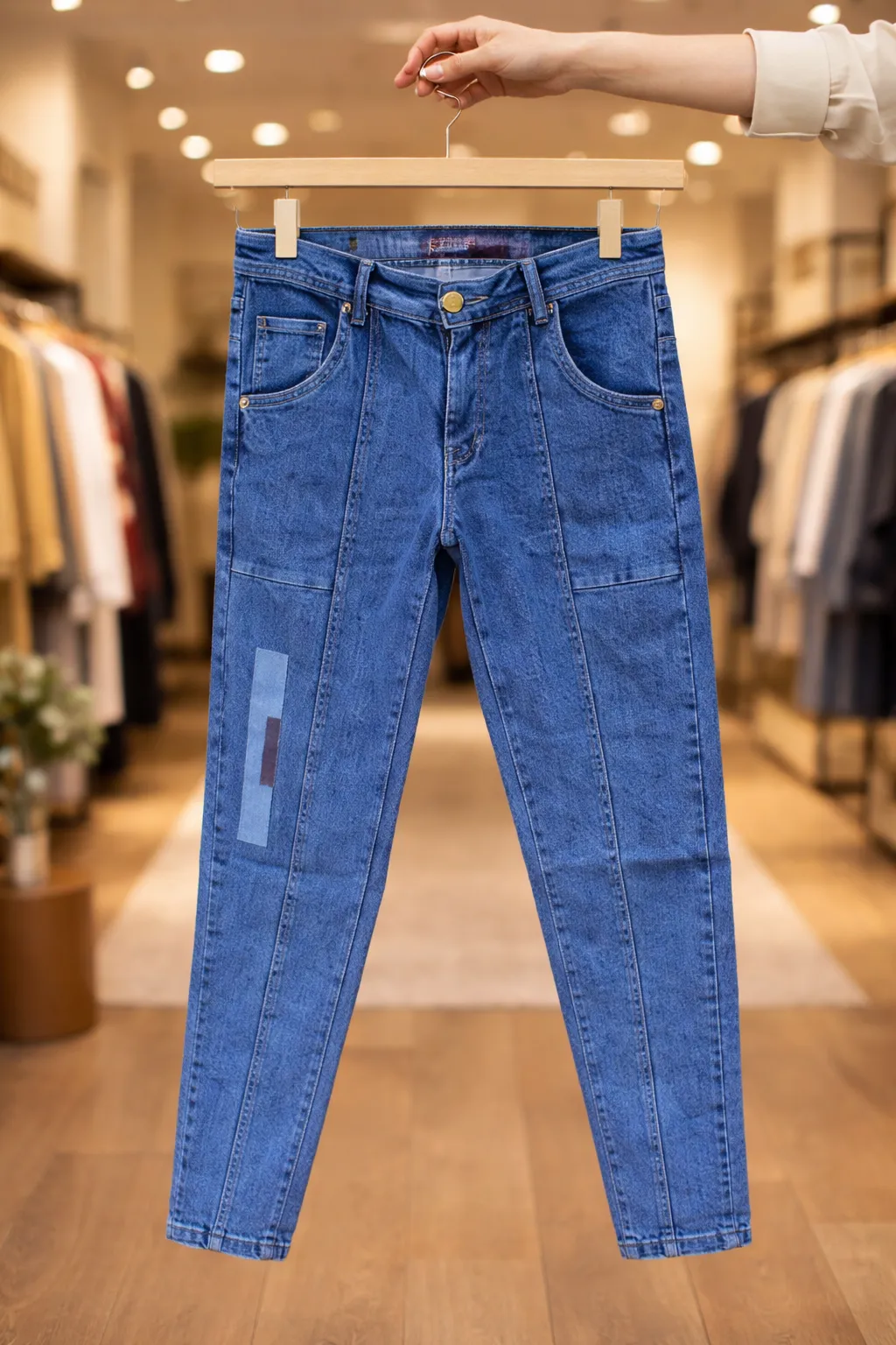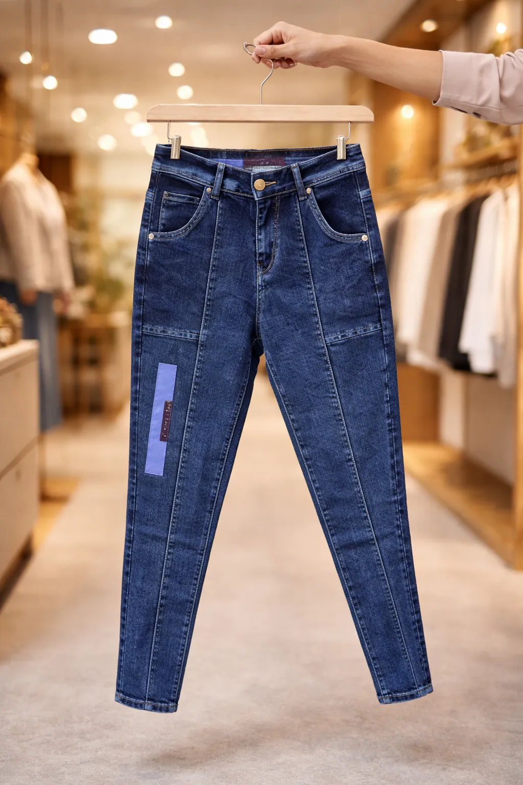 The rich blue denim base offers a timeless and versatile appeal, while the structured panel detailing enhances the overall silhouette, giving it a contemporary and fashion-forward vibe. A subtle patch detail on the leg adds an extra touch of street-style aesthetics.