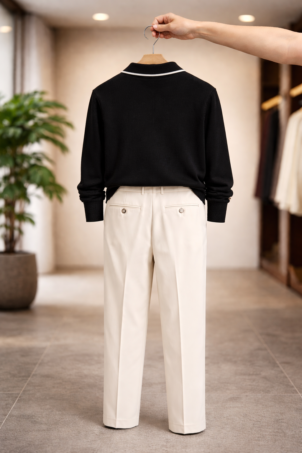 The black polo sweater stands out with its subtle contrast piping on the collar, adding a touch of elegance to the minimal design. The slim-fit beige trousers enhance the overall silhouette, offering a sharp and structured finish that flatters every body type. Paired with classic white sneakers, this outfit delivers the perfect balance of comfort and style.