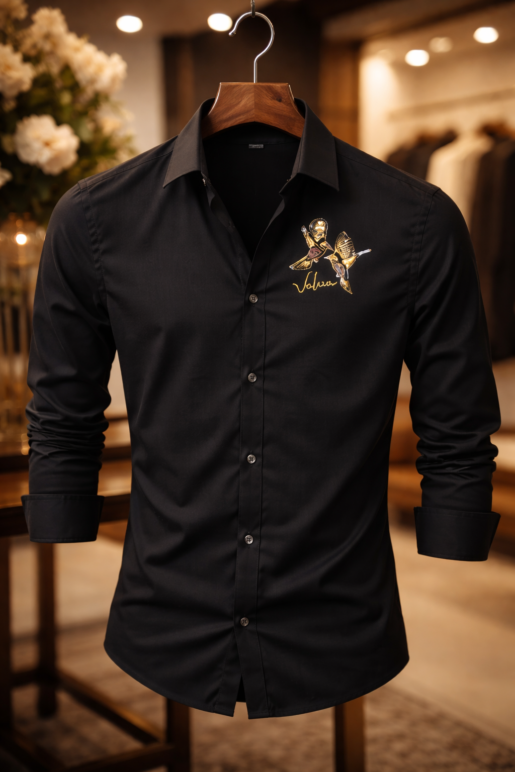 Upgrade your wardrobe with this bold and artistic men’s premium shirt, designed to make a striking statement. This elegant white shirt features a unique gold skeleton embroidery, adding a blend of edgy style and luxury to your look.