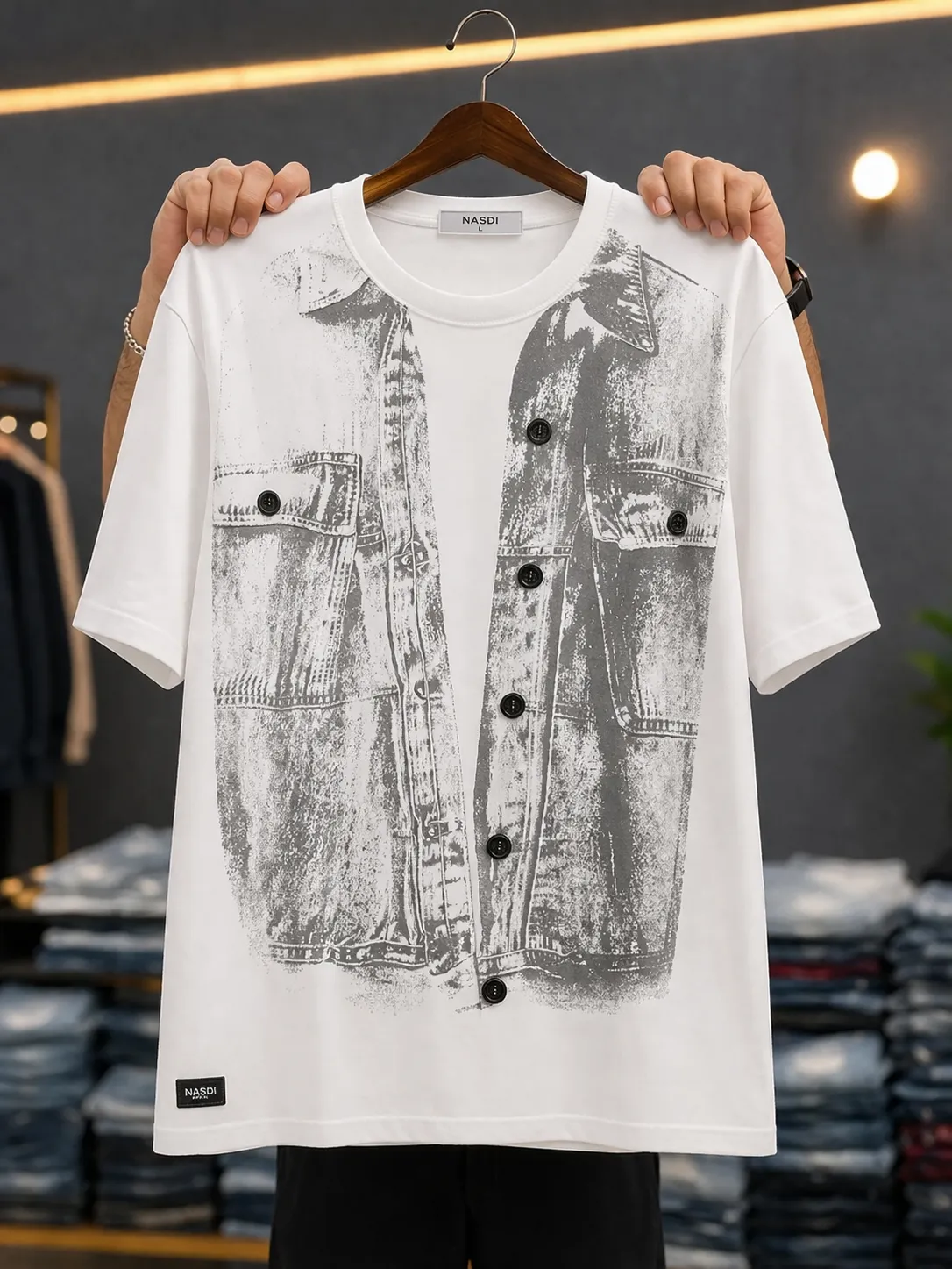 Upgrade your casual wardrobe with this stylish men’s printed t-shirt, designed for a bold and modern streetwear look. Featuring unique graphic prints like a star design and denim jacket illusion print, this t-shirt adds a cool and eye-catching vibe to your outfit.