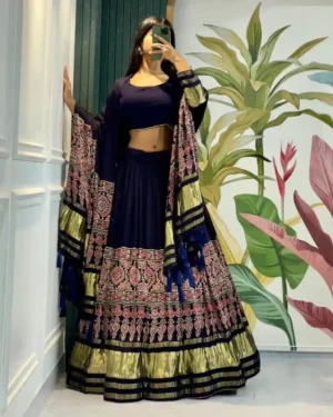 Step into the festive spotlight with the Midnight Gold Luxe Chaniya Choli, a regal fusion of deep elegance and opulent detailing designed for women who invest in heritage fashion with high style returns. Ideal for weddings, festive galas, and cultural soirées, this ensemble is a statement piece that appreciates in value with every wear.