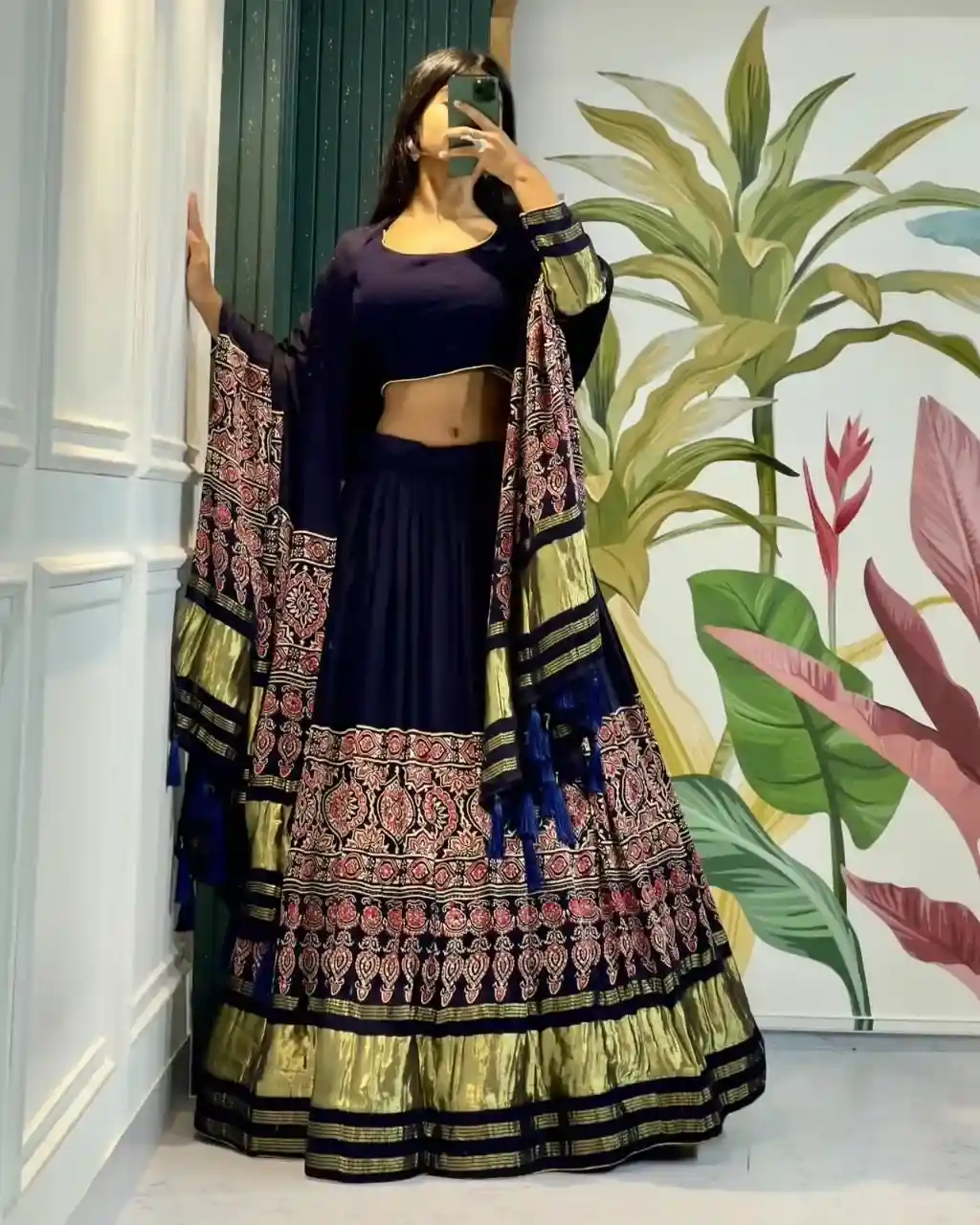 Completing the set, the navy dupatta mirrors the lehenga’s rich gold borders and printed motifs, tied together with tassel accents for a refined finish. The combination of deep navy and radiant gold evokes royal wealth, making it a perfect cultural investment for any high-profile occasion.