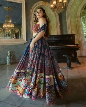 The blouse is an artwork in itself, featuring a daring sweetheart neckline adorned with ornate embellishments that echo the lehenga’s grandeur. Crafted for a flattering fit, it merges traditional embroidery with a bold contemporary silhouette, striking the perfect balance between heritage and haute couture.