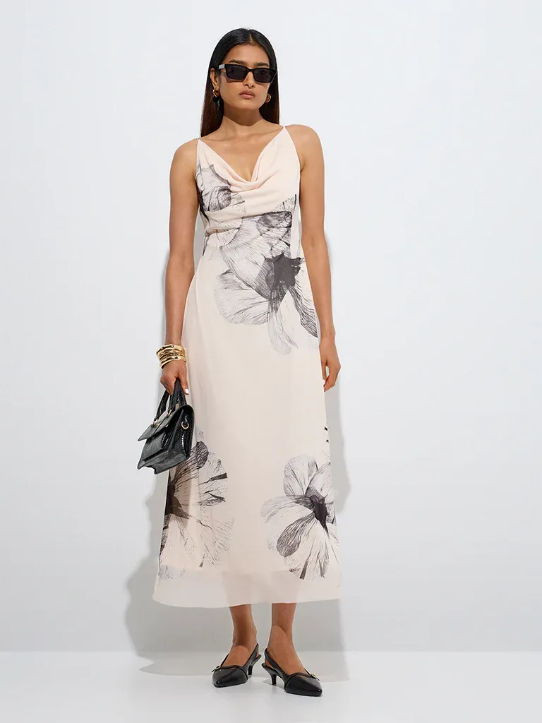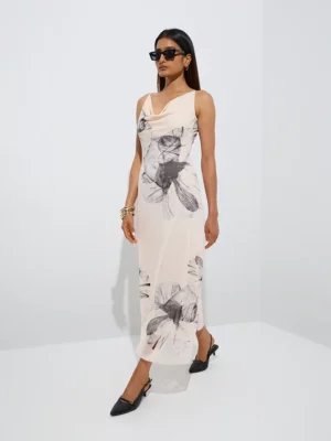 Monochrome Muse Cowl-Neck Floral Midi Dress – Beige/Black