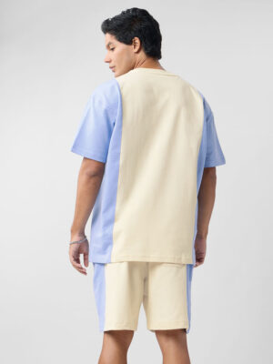 The oversized T-shirt features a lavender and grey color-block design, a classic round neck, and regular sleeves, giving it a striking visual contrast while maintaining casual wearability. The matching utility cargo joggers are built for function and style, featuring multiple flap pockets for storage, a mid-rise fit, and elasticated cuffs for a tapered, athletic look.
