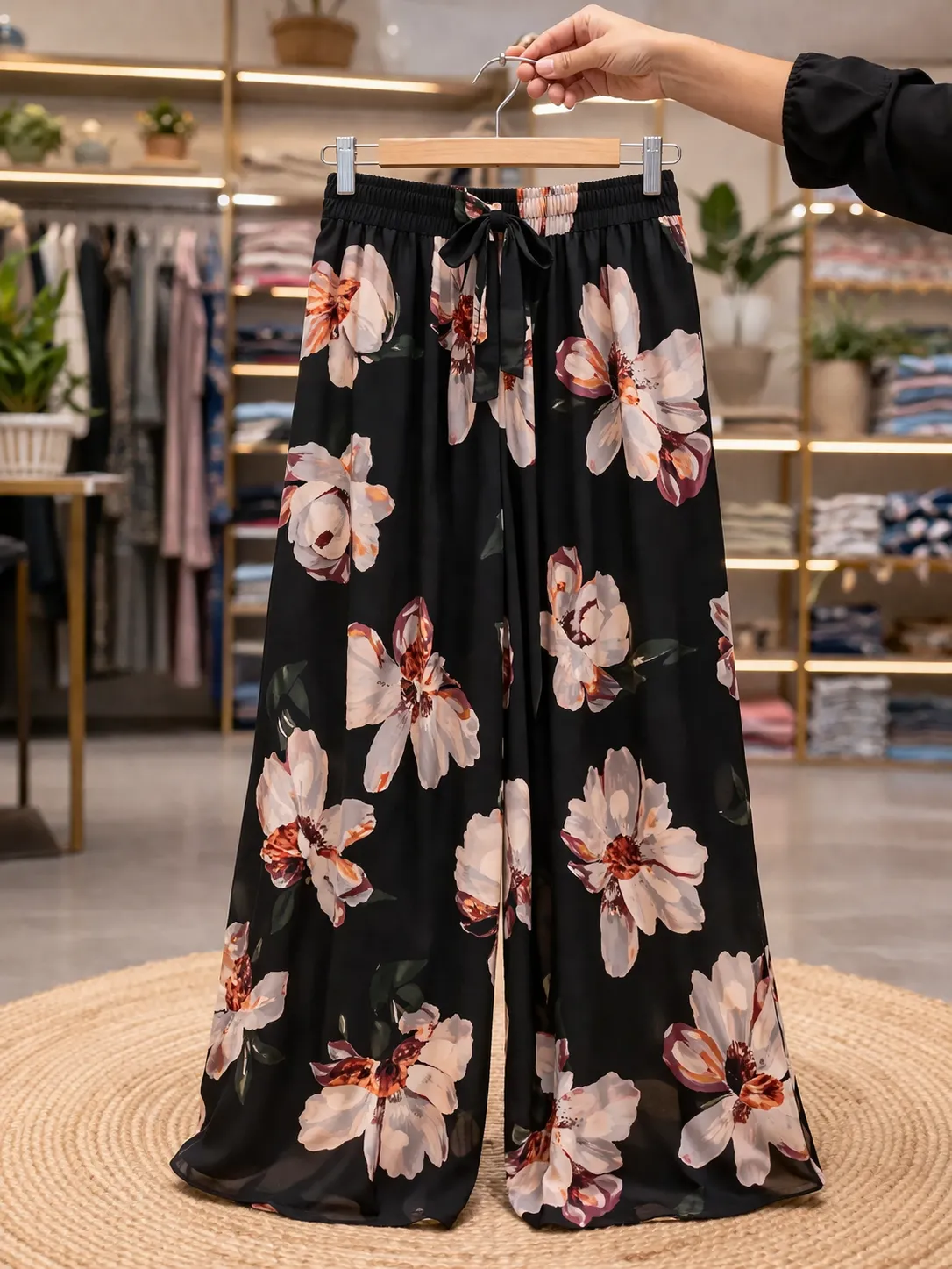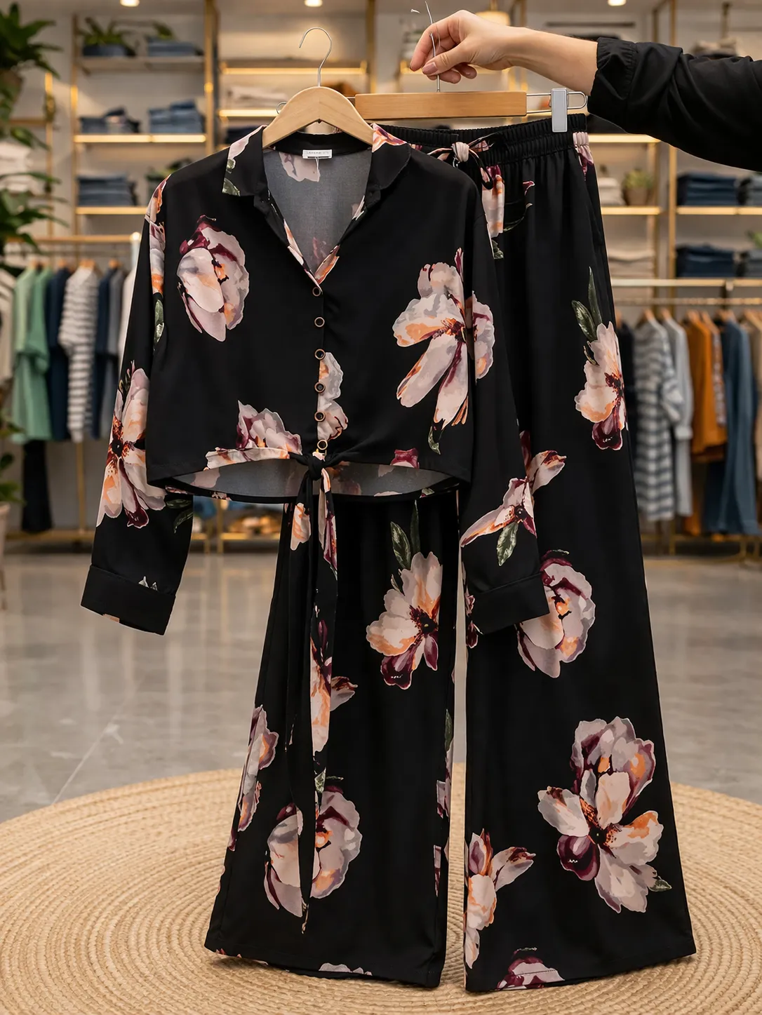 The black base with large floral prints adds a premium and eye-catching vibe, while the cropped top with front buttons gives a smart and trendy touch. The flowy flared pants enhance the overall silhouette, making it both comfortable and stylish.
