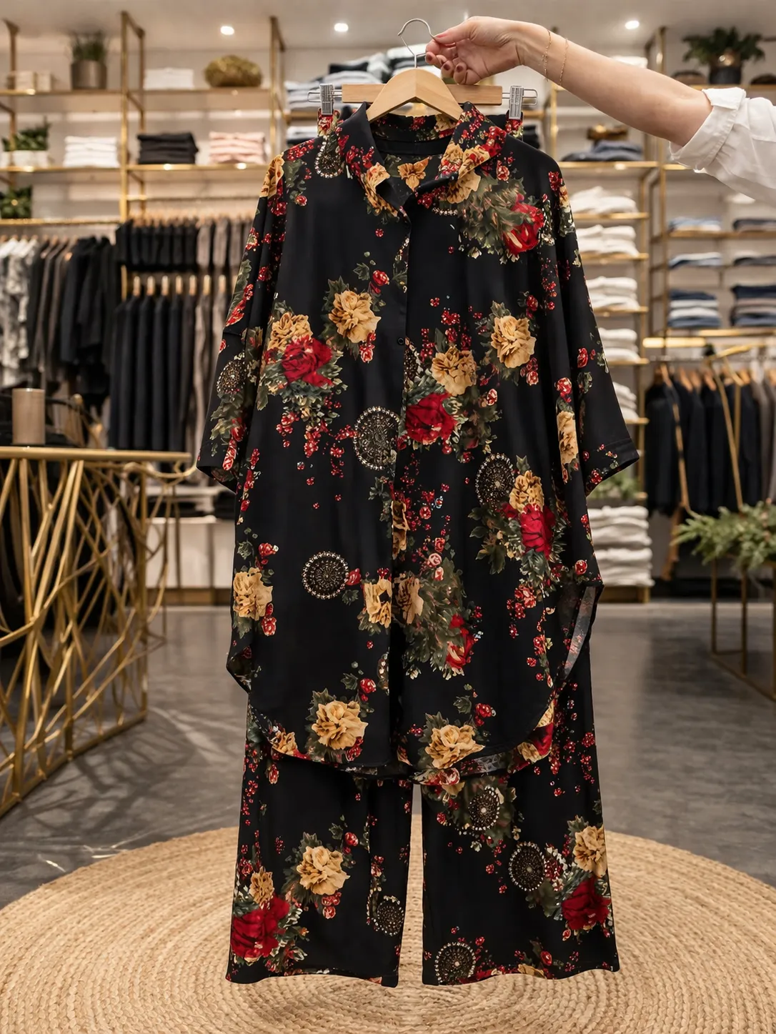 The oversized fit provides a relaxed and comfortable feel, while the button-down design and smart collar add a touch of sophistication. Whether you choose the cream base with red floral print or the black base with multicolor floral design, both options are perfect for creating stylish outfits.