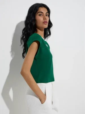 Crafted from premium ribbed knit fabric, it’s soft to the touch, comfortably breathable, and offers a subtle stretch for all-day wear. The vibrant deep green base provides a striking backdrop for the crisp white accents, giving the piece a clean yet dynamic visual contrast.