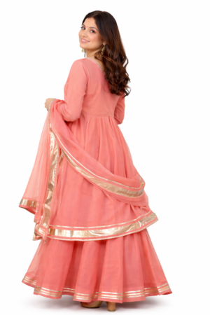 The soothing peach hue exudes femininity and freshness, while the minimal design is elevated with delicate gold detailing along the neckline, hem, and dupatta. The flared silhouette enhances movement and creates a flattering, regal look suitable for all body types.