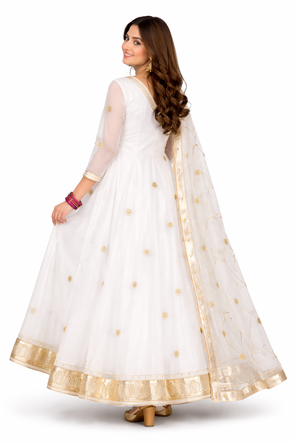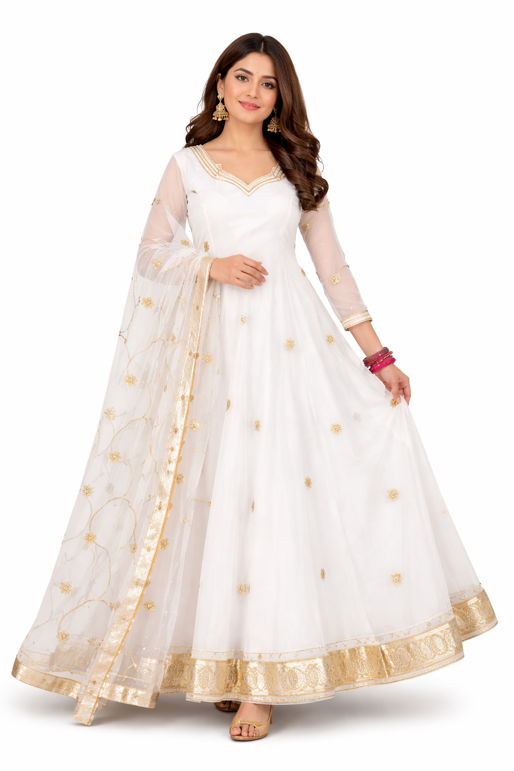 Women’s White Anarkali Suit Set – Gold Embroidered Elegance with Sheer Dupatta