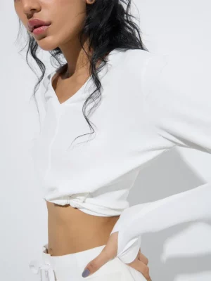 Women’s White Long-Sleeve V-Neck Knot Front Crop Top – Chic Minimalism with a Modern Twist