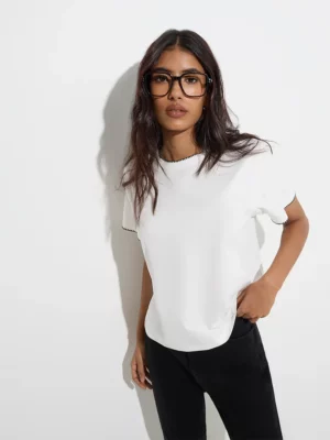 Crafted from a lightweight, breathable fabric blend, it provides all-day comfort while maintaining a smooth, polished drape. The crisp white base instantly refreshes any outfit, while the delicate black contrast stitching along the neckline and sleeve hems adds a refined, contemporary edge. This minimal yet distinctive detail elevates the piece, ensuring it stands out from the typical plain white tee.